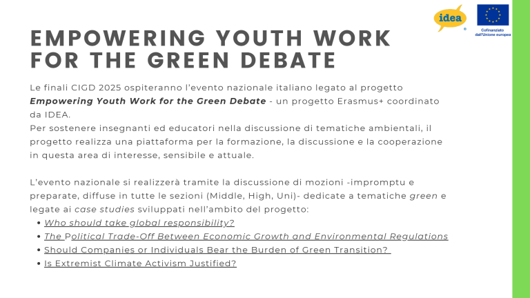 Nella sua implementazione, il progetto ha coinvolto anche SNDI APS a cui è stato chiesto di occuparsi della diffusione sul piano nazionale in particolare dei casi di studio osservati e proposti nell’ambito del progetto. Per farlo, sono state formulate delle mozioni su tematiche ambientali legate ai casi di studio, che hanno permesso a coach e debaters di approfondire il tema e mettere alla prova i materiali prodotti nell’ambito del progetto.